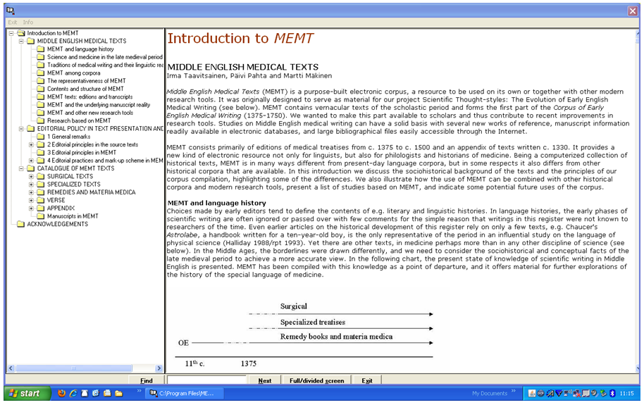 The corpus of Middle English Medical Texts (MEMT) was published on CD-ROM in 2005 (Taavitsainen et al. 2005). The corpus software included on the CD, a purpose-built software program MEMT Presenter, was designed by Raymond Hickey. MEMT includes about half a million words of running text, containing a representative sampling of vernacular English writing in the domain of medicine from the scholastic period, c. 1375 to 1500, including some medical verse texts, and a small appendix of trilingual Latin-French-English writings from c. 1330. The corpus comprises 86 texts of varying length; most samples are c. 10,000 words, while short texts are included in toto.