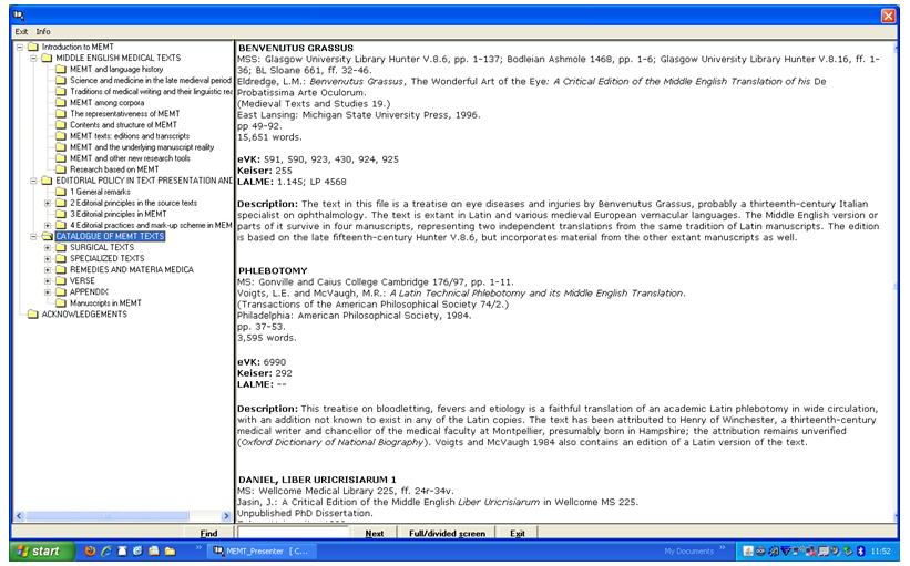 In the corpus structure, organized in MEMT Presenter into a tree view, the medical prose texts, which form the main bulk of the corpus data, are divided into three categories. These categories represent a widely accepted tripartite division of Middle English medical texts into three traditions of writing first suggested by Voigts (1982, 1984), i.e. academic writing, surgical writing, and remedybooks. In our corpus compilation, we adopted this three-part division, but modified it on the basis of our own knowledge of the field. In MEMT the text categories are labelled surgical texts, specialized texts, and remedies and materia medica.