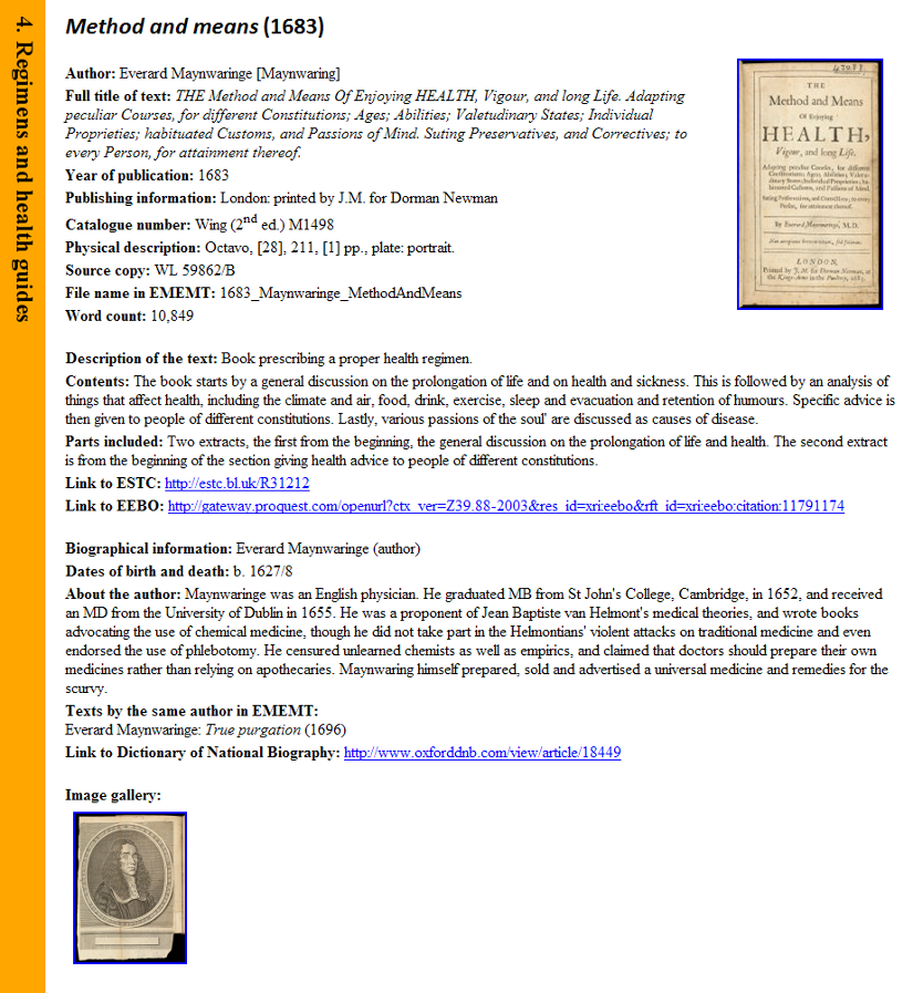 EMEMT = Early Modern English Medical Texts 1500–1700. CD-ROM. Software by Raymond Hickey. Early Modern English Medical Texts: Corpus and Studies, ed. by Irma Taavitsainen & Päivi Pahta. Amsterdam/Philadelphia: John Benjamins. http://www.helsinki.fi/varieng/CoRD/corpora/CEEM/EMEMTindex.html