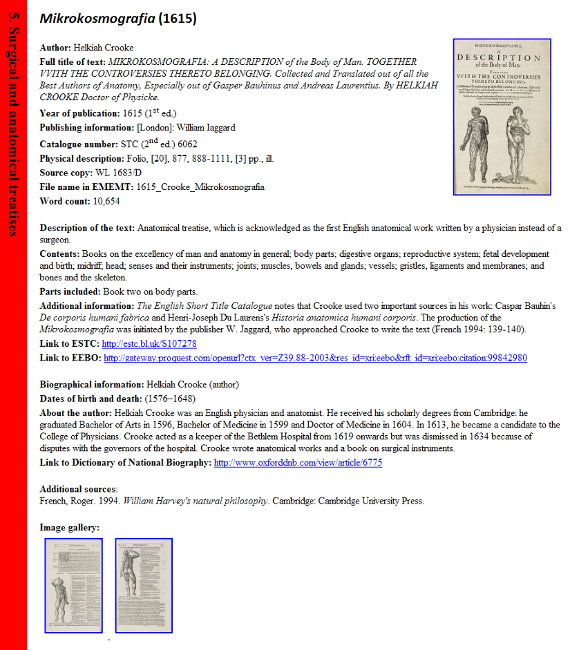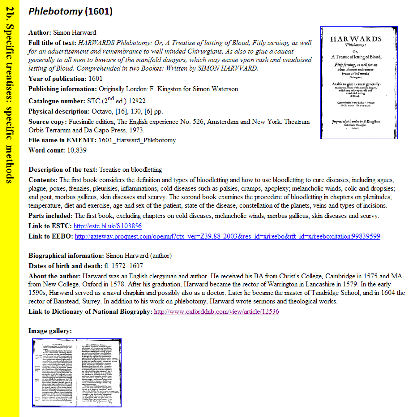 Taavitsainen, Irma, Päivi Pahta, Turo Hiltunen, Ville Marttila, Martti Mäkinen, Maura Ratia, Carla Suhr & Jukka Tyrkkö with assistance of Alpo Honkapohja, Anu Lehto & Raisa Oinonen. 2010. Early Modern English Medical Texts 1500–1700. CD-ROM. Software by Raymond Hickey. Early Modern English Medical Texts: Corpus and Studies, ed. by Irma Taavitsainen & Päivi Pahta. Amsterdam & Philadelphia: John Benjamins. http://www.helsinki.fi/varieng/CoRD/corpora/CEEM/EMEMTindex.html