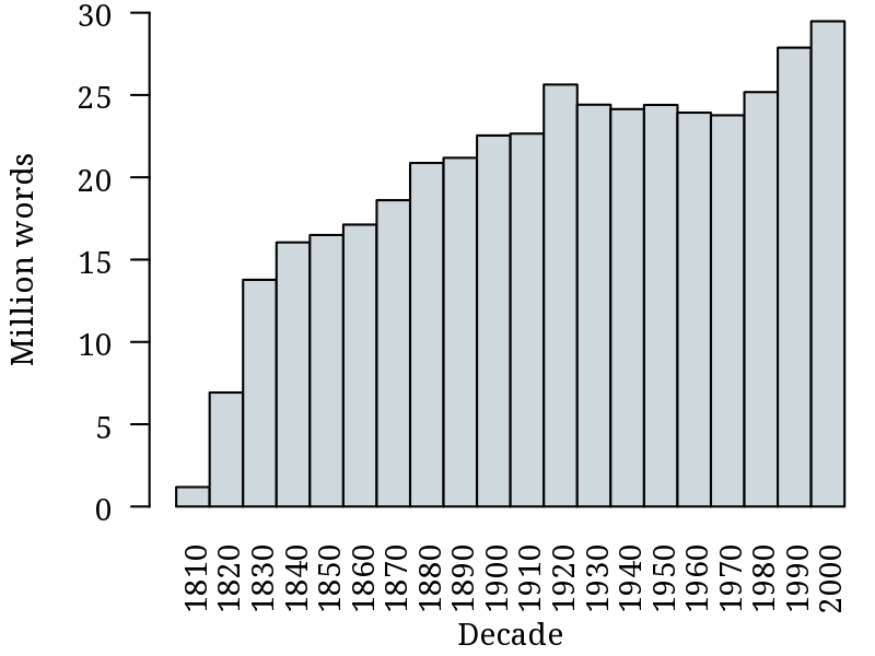 The instances of non-locative inversion investigated in this study were obtained from the Corpus of Historical American English COHA (Davies 2010–). The corpus covers about 400 million words from books of fiction (about 50 percent) as well as magazines, newspapers, and non-fiction books. The earliest texts are from the 1810s, and the most recent texts are from 2009. The bar chart in Figure 1 displays the distribution of words across the decades from 1810 to 2000. The average number of words per decade in the whole corpus is 20.3 million words. As Figure 1 shows, the text size for the first decade is much smaller than for the remaining decades (1.2 million words). In order to avoid possibly skewed results due to this relatively small number of words, texts from that decade were not considered in this study.