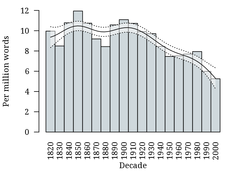 The histogram in Figure 2 shows the overall distribution of occurrence of non-locative adjective phrase inversion by decade in COHA. Each bar corresponds to the number of observations per million words in the sub-corpus for that decade. The thick line in the figure is the regression line from the non-parametric model (i.e. the estimated frequency), together with the variability band.