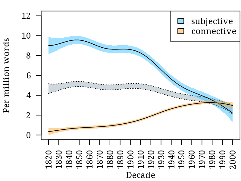 For this plot, the three subjective types were combined (blue estimate), as were the two connective types (orange estimate). The grey band is the variability band of an “equality” model. This model tests the assumption that there is no significant difference between the subjective and the connective types. For the most part of the observation period, the two estimates fall clearly outside the grey band. Starting with the 1970s, however, the grey band and the other two estimates overlap. This means that the “equality” model cannot detect a significant difference between the two types any more – apparently, the subjective and connective functions are equally frequent in the subcorpus spanning the last decades.