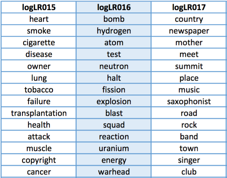 While it is difficult to evaluate the accuracy of the topic model, it allows users to browse the content of a large corpus, and in our case, learn a good bit about history. Figure 14 gives an example of three topics and the keywords found in them (each keyword is a participant in a compound noun, either as head or as dependent).