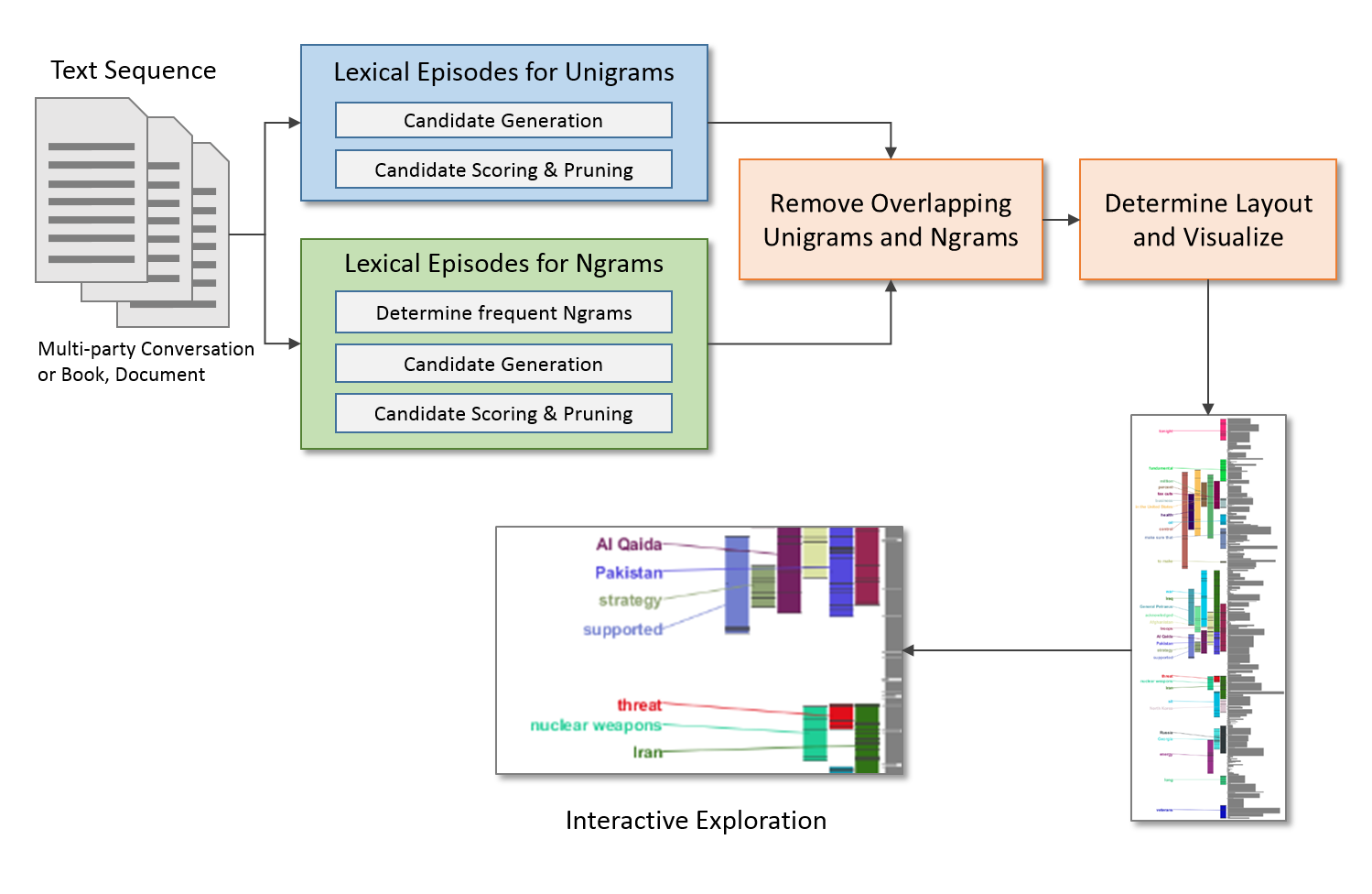 In line with the concept of lexical chaining, Lexical Episodes are defined as the portion within the word sequence of a corpus where a certain word or feature appears more densely than expected from its frequency in the whole text. Lexical Episode Plots (Gold, Rohrdantz & El-Assady 2015) provide keywords at any level of detail from the text, from sentences to paragraphs to documents and time periods, allowing readers to find passages, documents or trends in society over periods of time. These plots create overviews of text corpora to enable a content-independent distant and close reading. On the complete corpus level, an overview of the most frequent episodes can be generated to identify content-related patterns and trends. When using linguistic features we can also track linguistic characteristics of genres such as complex noun phrases, and linguistic changes.