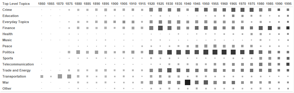 Figure 11. Heat Map View showing the number of documents per year and top-level topic. Through this visualization characteristic features of every time period are highlighted. Some events become quickly visible, e.g. the Second World War and the preceding financial crisis.