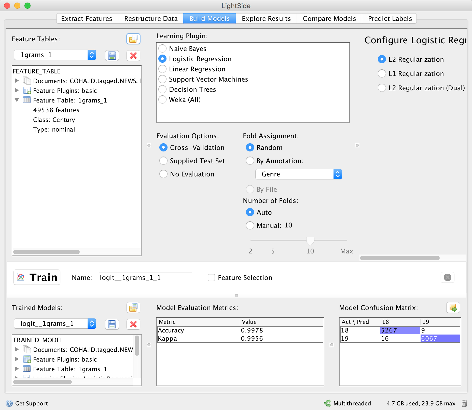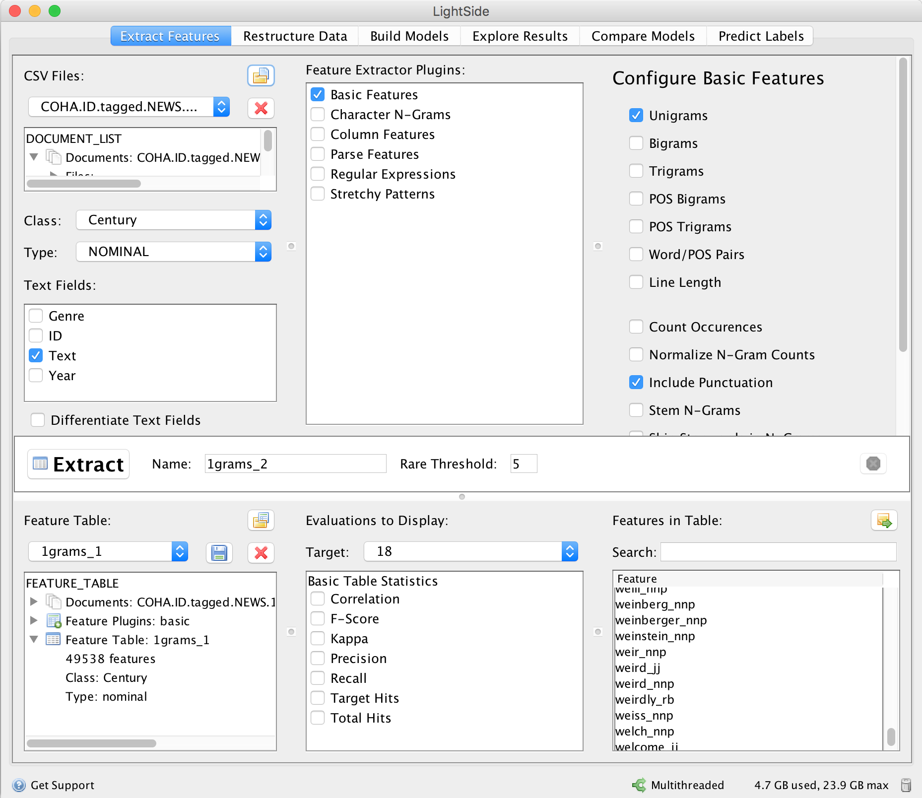 After converting the input text into a comma-separated format (CSV, easily created in e.g. Excel or OpenOffice), where one column contains the category to be classified, and the other column the entire text of the document, it can be loaded into LightSide. Figure 7 shows that we want to predict the Century (18 for the texts from 1860 to 1899, and 19 for the texts from 1980 to 1999) as a nominal category, based on the Text column. We have selected single words as features (Unigrams). Figure 7 shows that 49,538 unigram features were extracted, each corresponding to one of the 49,538 word types that appear at least 5 times (Rare Threshold).