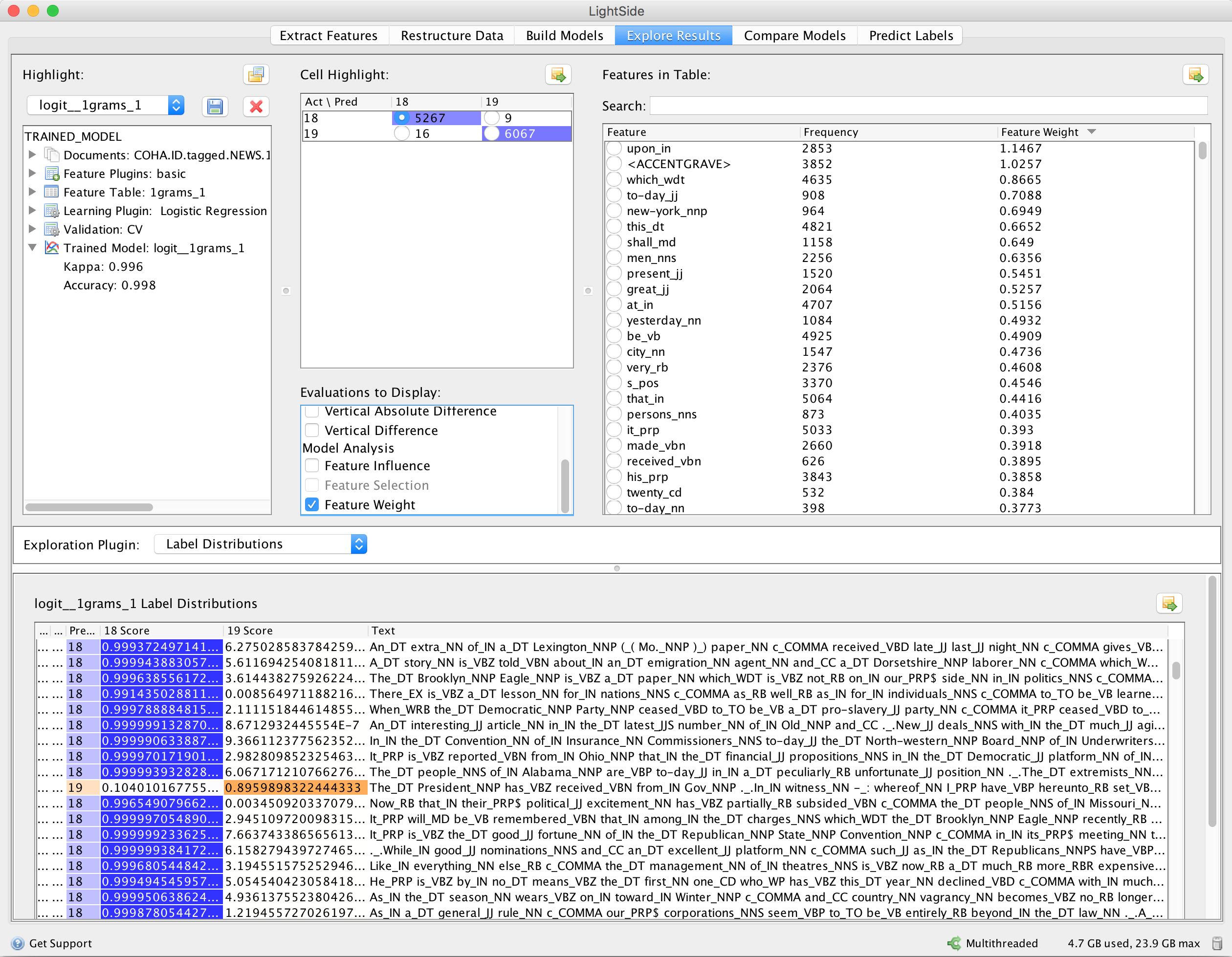 In the next step, we build a document classifying model based on the features that we have selected. LightSide allows one to choose from a large number of powerful, state-of-the-art machine learning algorithms, from Naive Bayes to Logistic Regression and the Kernel method (Support Vector Machines). The LightSide Manual gives a brief summary of the algorithms and of Machine Learning. As LightSide is a Weka wrapper, Weka configurations can be chosen as well. Even cross-validation is carried out automatically, making sure that the models do not overfit the data. The training phase can easily take between several minutes to hours, depending on the size of the data and the number of features, and may require a fast, recent computer. For testing, it is recommendable to start with a small number of features (100 to 10,000) for example by selecting a very high Rare Threshold, as high memory demands can easily crash the entire operating system, requiring a restart. During training, if the Multithreaded option is selected, all available processors are used, which means that the computer is completely occupied and hardly usable for other tasks in the meantime.