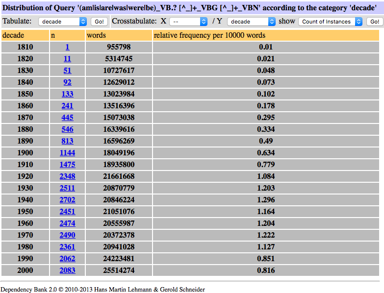 In addition to showing hits in an interactive KWIC view, Dependency Bank also compiles frequency tables automatically. Figure 1 shows a screenshot of the tool, providing the frequency of the progressive passive (e.g. is being eaten), which has been described as one of the few innovations of Late Modern English, and which is described as being more frequent and more acceptable in present day English (Aarts, López-Couso & Méndez-Naya 2012). As can be seen, the frequency of the progressive passive indeed increases, but it peaks around the middle of the 20th century, and is in fact slightly decreasing since. We searched for progressive passive with the following regular expression: (am|is|are|was|were|be)_VB.? [^_]+_VBG [^_]+_VBN, i.e. a verb followed by an -ing form and followed by a past participle.