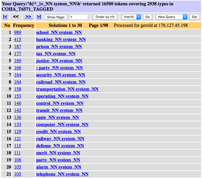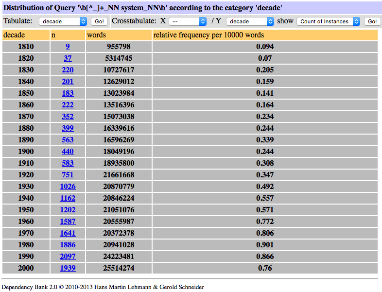 The same trends can also be observed in COHA. The general increase of noun compounds is composed of very many individual changes. We can zoom in on them by for example focussing on those head nouns which seem to be particularly likely to act as heads of noun compounds. Figure 3 shows a query on COHA of compound nouns headed by system. The increase has already started in the 19th century, but its pace has accelerated in the 20th century, as Figure 3 shows.