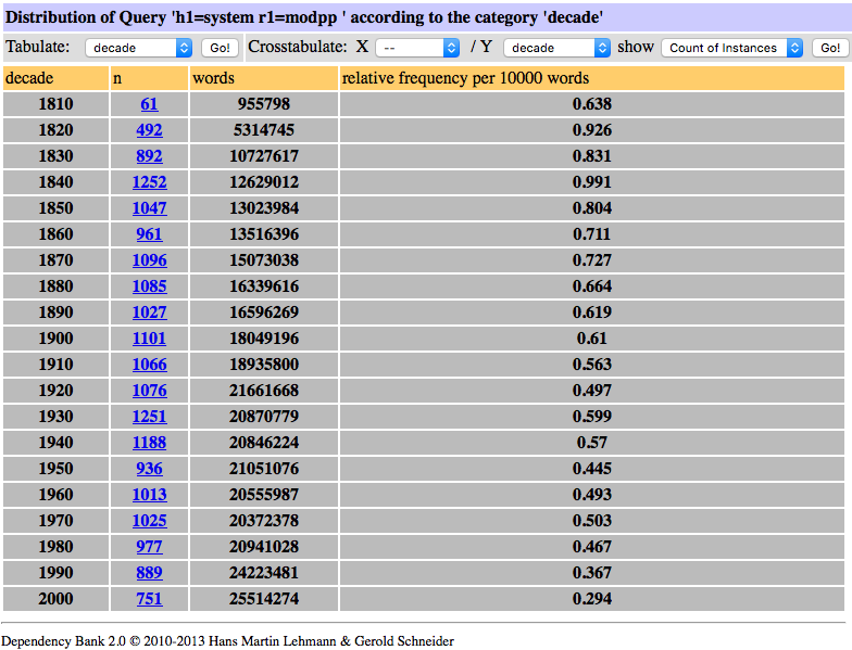 We showcase a number of approaches and visualization methods which we and our teams use or develop at the University of Konstanz and at the University of Zurich. We illustrate our approach on the Corpus of Historical American English (COHA). COHA was collected by Mark Davies and ranges from 1810 to 2009. With over 400 million words, it is one of the largest corpora of diachronic English. The corpus is divided into the coarse genres of Fiction, Magazine, Newspaper, and Non-fiction Books (see Lijffit et al., this volume, for another approach to “core” genres of English). The CoRD entry for COHA gives more details. We have syntactically parsed the entire corpus with a dependency parser (Schneider 2008, Lehmann & Schneider 2012a).