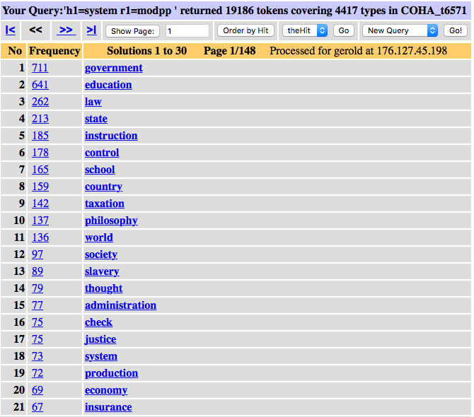 If we compare lexical modifiers, we see considerable differences between the noun compound modifiers, listed by decreasing frequency in Figure 5, and the modifiers in the form of prepositional phrases (PP), listed in Figure 6. We can see, for example, that school system tends to be a compound noun, while the PP-variant system of school is much lower ranked. On the other hand, system of government, the most frequent PP-form, is very rarely rendered as compound noun, government system in fact appears at rank 251, it occurs only 11 times in COHA. We will investigate the development of individual combinations in Section 2.3.