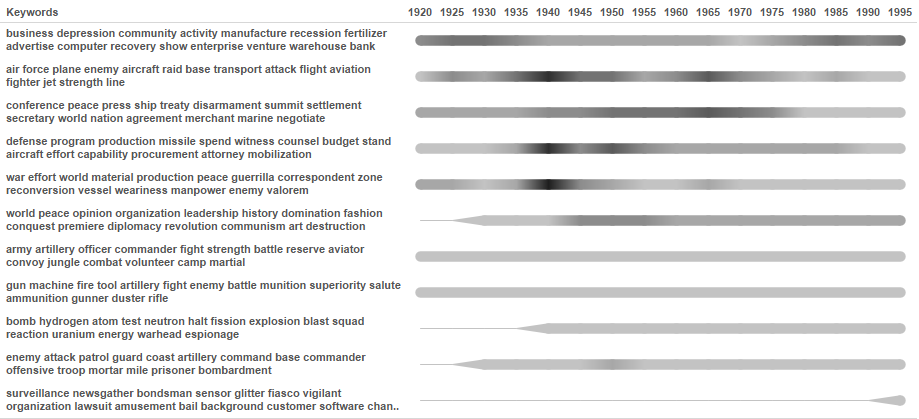 Figure 12. Density Chart highlighting the presence of topics of war and peace in the news section of COHA. This visualization emphasizes the peaks of each sub-topic (darker areas correspond to a higher density of news articles).